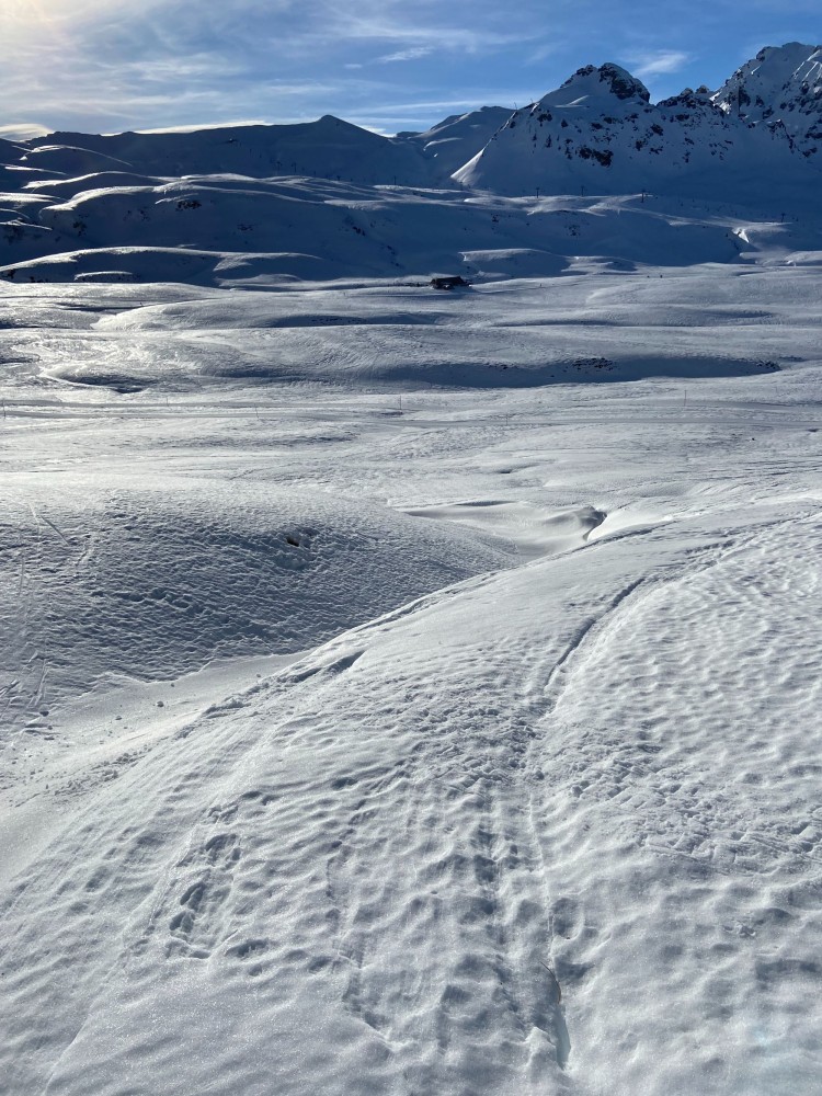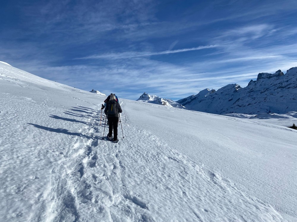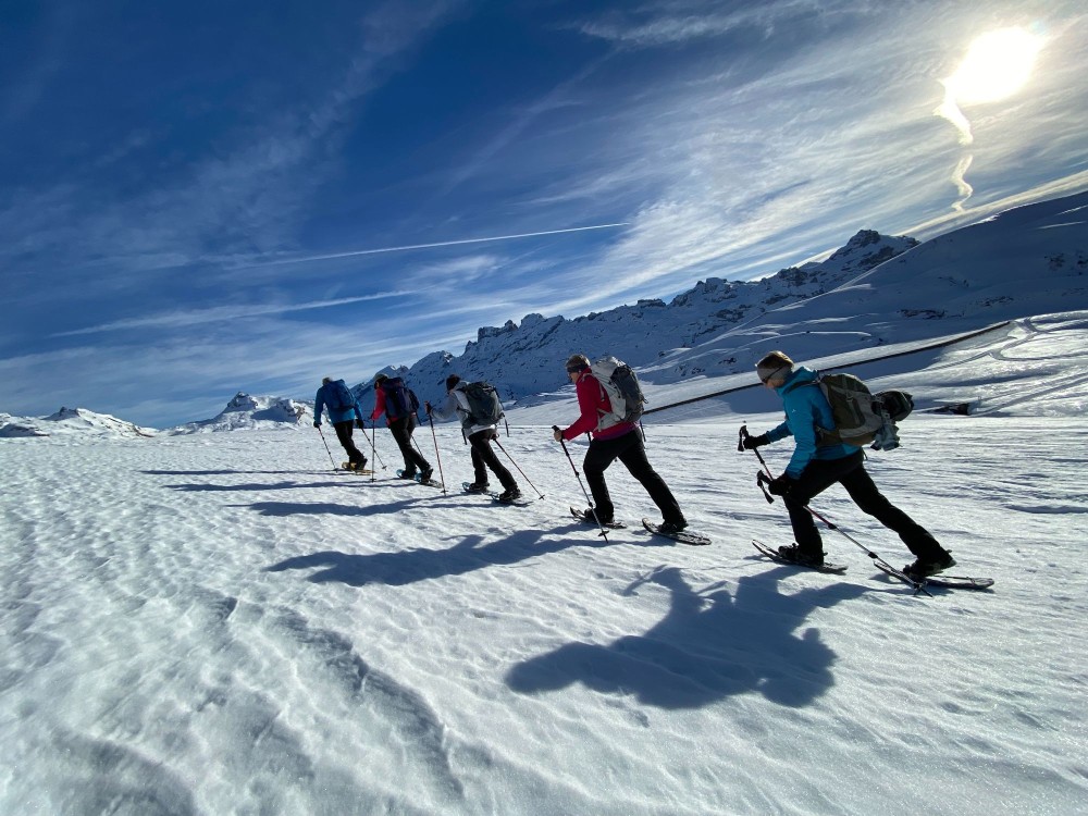Schneeschuhe, Stöcke mit grossen Tellern, wasserdichte Bergschuhe, ggf. Gamaschen, LVS-Set, warme Winter-Kleidung, Wechselkleidung, Windschutz, Sonnenschutz