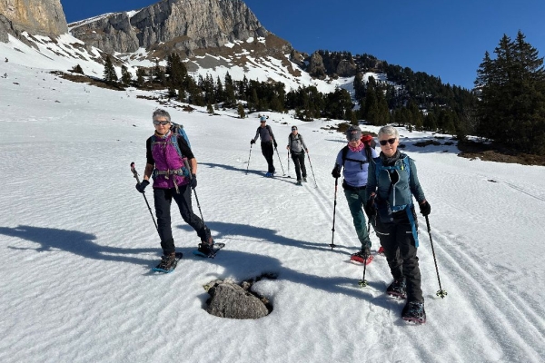 Heute wollen wir auf den Hohgant. Wir marschieren am Morgen los und geniessen den glitzernden Schnee, die warmen Sonnenstrahlen und die märchenhafte Landschaft. Da und dort sichten wir Gämsen. Der Aufstieg ist sehr abwechslungsreich und zwischendurch müssen wir die Schneeschuhe ausziehen und über Felsblöcke kraxeln. Oben angekommen, geniessen wir die herrliche Aussicht auf die umliegenden Berge. Der Rückweg führt uns durch eine aussergewöhnliche Landschaft mit tiefen Mulden und speziellen Steinformationen, welche aus dem Schnee ragen.