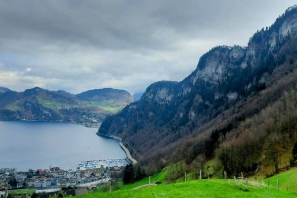 Auf dem Gipfel wird die Aussicht spektakulär. Senkrecht unter uns liegt der Bootshafen von Hergiswil und der Vierwaldstättersee, umrahmt vom Bürgenstock, der Rigi und der Kastanienbaum-Landzunge.