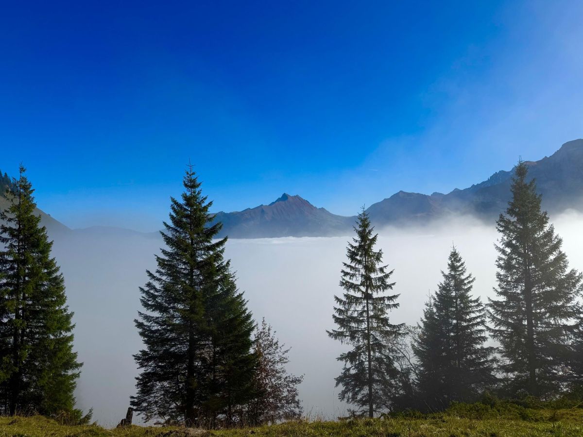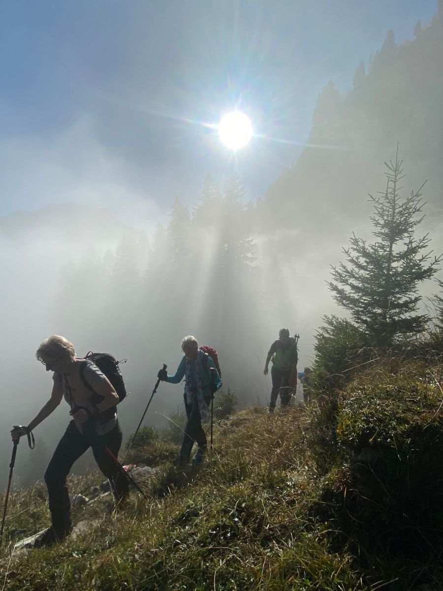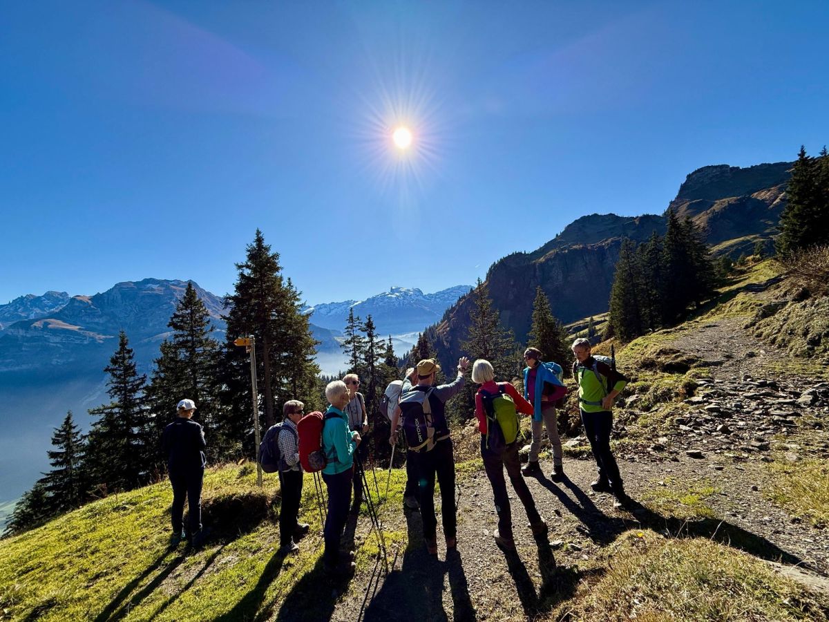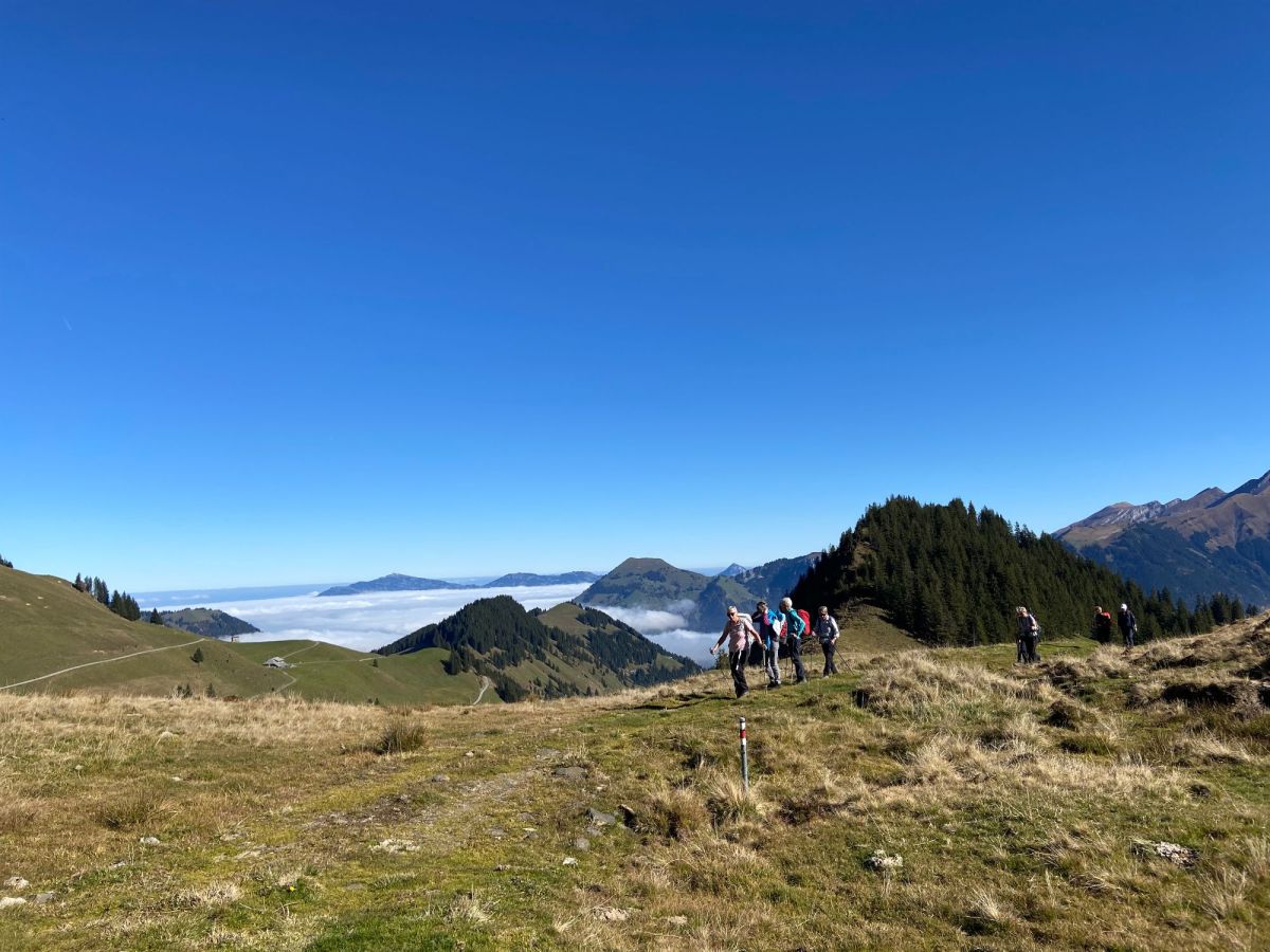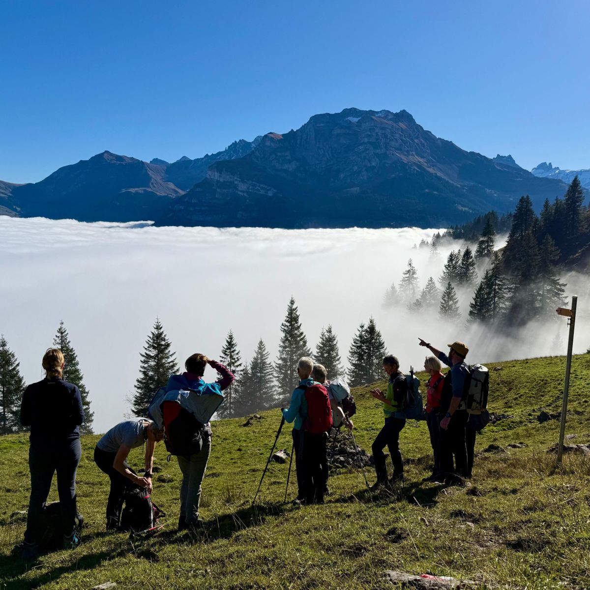 Zuerst folgte die Gruppe der Engelbergeraa in Richtung Wolfenschiessen. Der Herbst hielt in den vergangenen Tagen Einzug und so leuchteten die bunt gefärbten Blätter der Laubbäume im grauen Herbstmorgen um die Wette. Mit der Kleinseilbahn, besser bekannt als Buiräbähnli, ging es dann gemütlich nach Bielen, was aber noch nicht reichte, um dem Herbstnebel zu entkommen. Oben angekommen, teilte sich die Gruppe auf. Während die einen eher gemütlich in Richtung Diegisbalm wanderten, um dort nochmals die Seilbahn nach Oberalp zu nehmen, stiegen die anderen in Richtung Zingeli auf. Und genau dort, kurz unterhalb der Alphütte entstiegen wir dem Nebel und wurden von den wärmenden Sonnenstrahlen empfangen. Ein perfekter Platz, um sich auszuruhen, die Ruhe zu geniessen und dabei die frisch angeschneiten Berggipfel, sowie das Nebelmeer zu bewundern. Weiter ging es vorbei an Karst- und Moorformationen übers Feldmoos zur Schellenfluehhütte, wo sich beide Gruppen wieder zu Mittagessen trafen. Bei bestem Wetter und ausgelassener Stimmung gabs etwas feines zum Essen und für einige ein Kaffee „Ewigi Liebi“. Benannt nach dem bekannten Jodellied. Gemeinsam wanderten wir entlang des Ronengrat zur Gummenalp und dann durch den Hexenwald ins Wirzweli. Auf der Sonnenterasse des Bergrestaurants genossen wir bei Kaffee und Kuchen nochmals die wärmenden Sonnenstrahlen. Inzwischen hatte sich der Nebel komplett aufgelöst, so dass man eine herrliche Aussicht über das ganze Tal hatte. Schlussendlich ging es dann mit der Luftseilbahn zurück ins Tal. So nahm die Wandersaison 2025 ein gelungenes Ende. Oder doch noch nicht? Denn eine Teilnehmerin hatte noch nicht genug vom Wandern und nahm den Weg nach Stans ebenfalls zu Fuss auf sich.