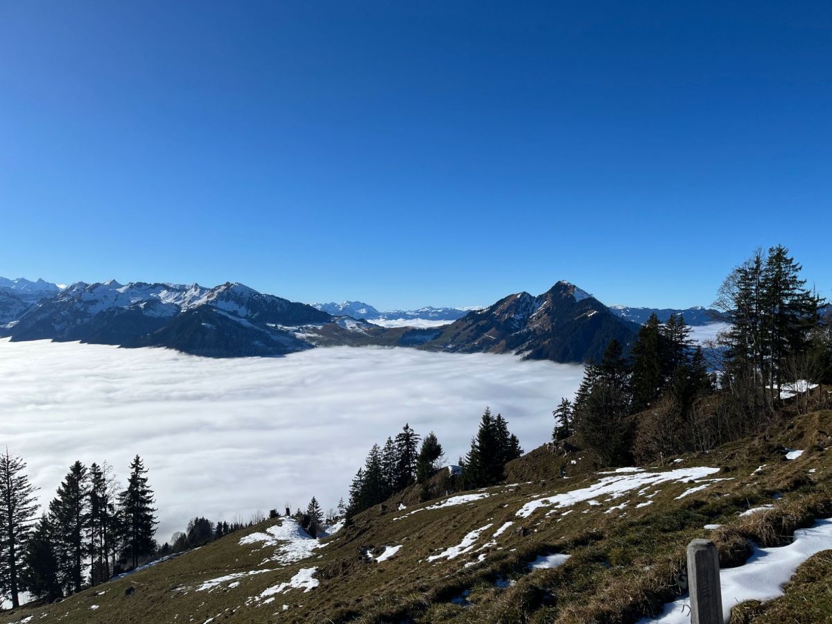 Doch auf der Wetterkarte zeigte sich immer mehr, dass wir weiterhin auf das stabile Hochdruckwetter rechnen dürfen. Da sich der auf Niederrickenbach noch liegende Altschnee für eine schöne Schneeschuhwanderung nicht mehr eignet, wird den Gästen der Nidwaldner Wanderwegen statt der Schneeschuhwanderung eine Winter-Panoramawanderung angeboten.