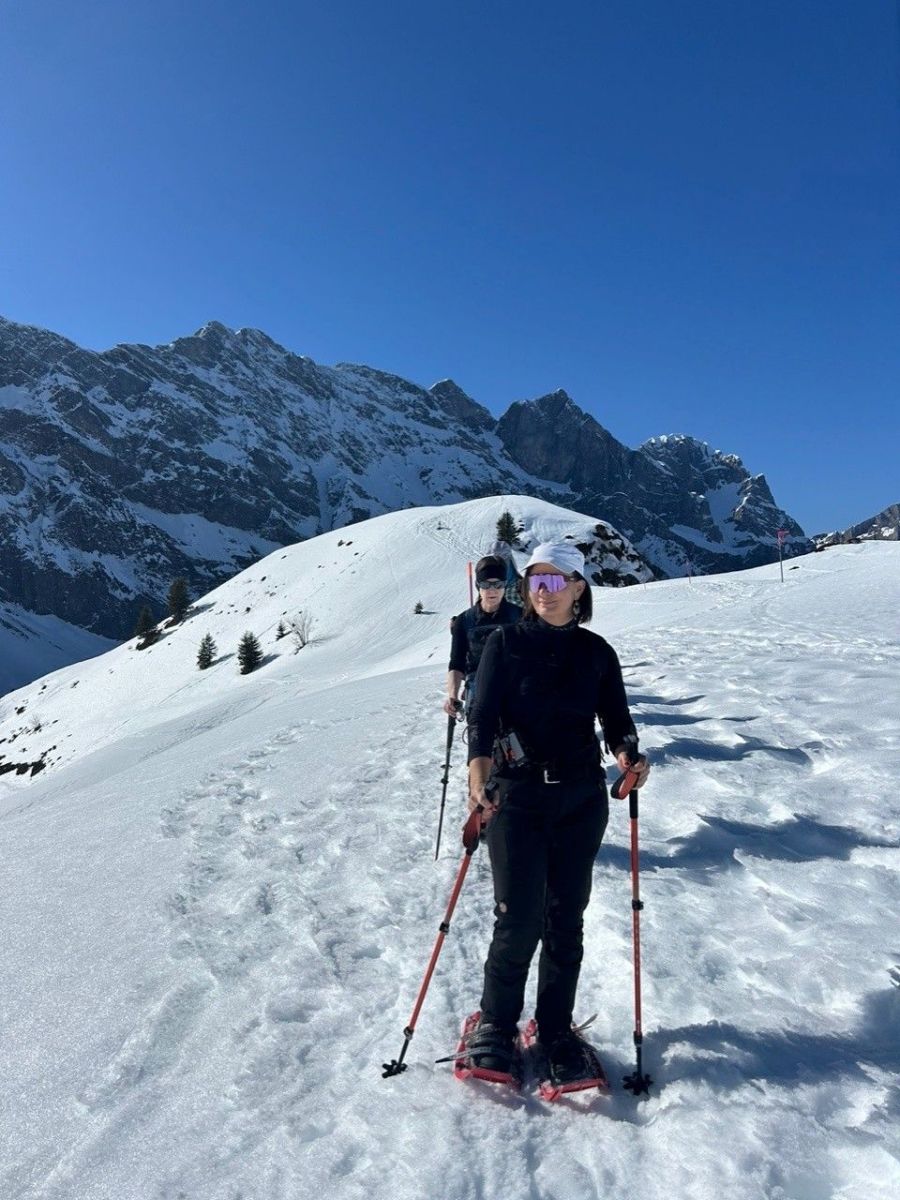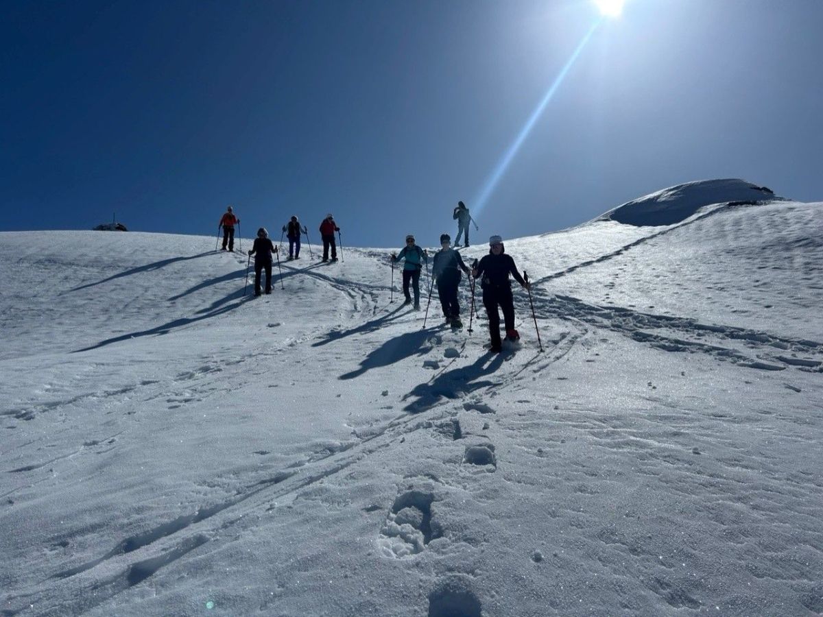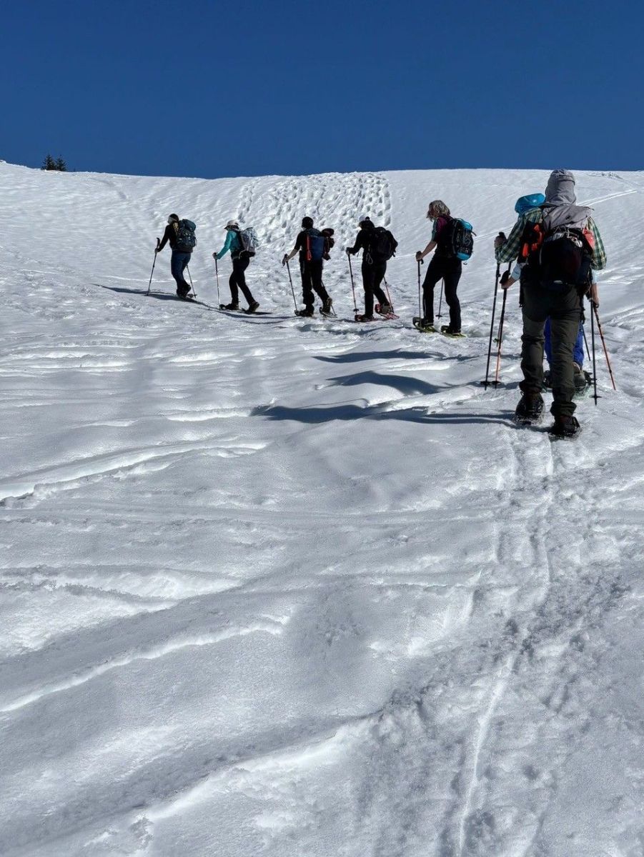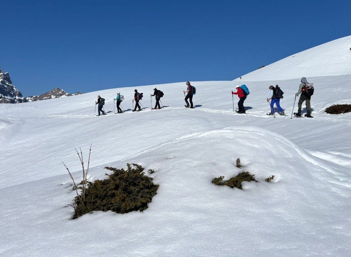 Der Titlis Gletscher glitzerte in weiss vor dem tiefblauen Himmel und auch der eingeschneite Trübsee strahlte eine großartige Atmosphäre aus. Die Berge und die tollen Teilnehmenden strahlten mit der Sonne um die Wette. Nach dem ersten Aufstieg zum Bitzistock genossen wir die absolute Ruhe um uns herum. Die Gämsen versteckten sich heute gut – wir konnten sie nicht an ihrem «üblichen Plätzli» entdecken. Über weite Ebenen streiften wir durch die imposante Bergwelt. Die ausgiebige Mittagsrast in der Sonne genossen wir auf dem eigens dafür geschaufelten Schneesofa. Bei anregenden Gesprächen verzerrten wir unser Picknick.